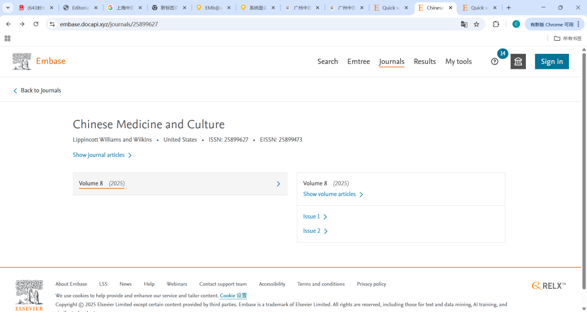近日,《中医药文化(英文版)》(Chinese Medicine and Culture)经过国际权威医学文献数据库Embase的严格遴选与评审,正式获准收录并上线。自2025年起,本刊发表的全部学术论文已同步纳入该数据库,供全球研究者检索查阅。